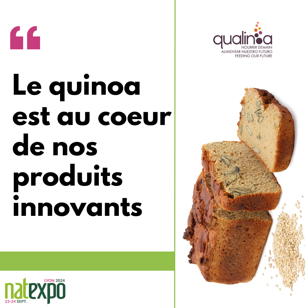 Qualinoa participera pour la première fois cette année à Natexpo. On vous les présente 🍞. La R&D (recherche & développement) est au cœur de notre activité à Qualinoa (SAS de l’ESS) avec la conception et la formulation de produits alimentaires innovants à très haute valeur nutritionnelle, sans gluten et sans additifs, à base majoritaire…