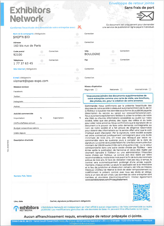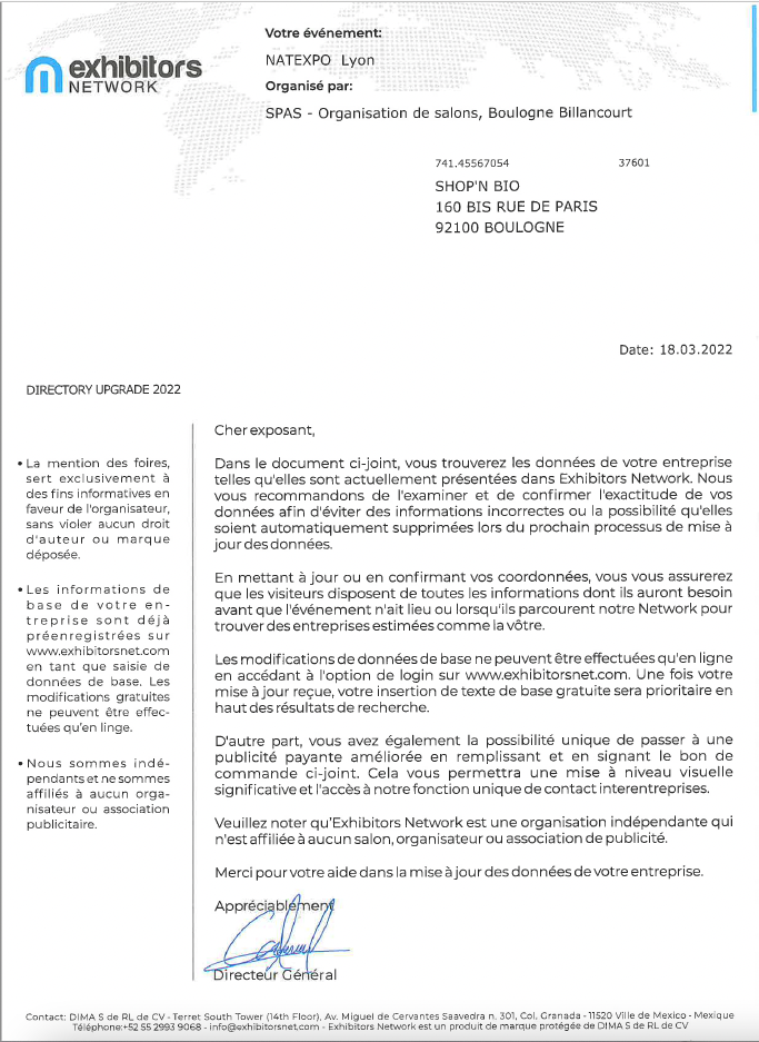 You will then receive an invoice from International Fairs Directory or Exhibitors Network among others, as well as reminders from their debt collection company IBCM LTD : Please let us know and do not pay any amounts “due” under any circumstances.